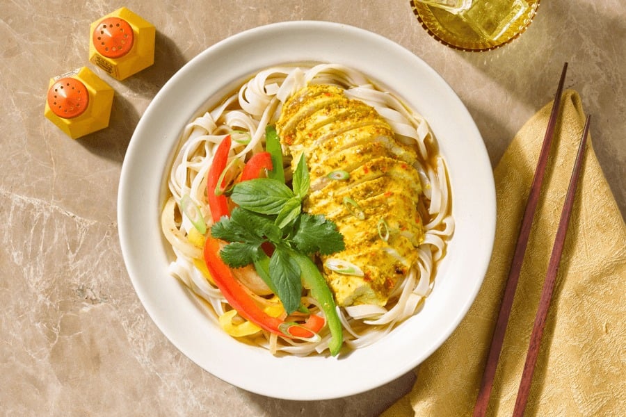 The Chicken Pho with Rice Noodles, Fresh Herbs and Peppers is a light and aromatic meal, which is suitable to people who want to have a satisfying meal, which is not too heavy. This dish is a blend of British chicken breast, which has been marinated and then combined with smooth rice noodles in a delicately flavoured broth. This dish is not only very attractive because of the fresh herbs and crisp peppers used in it but also contains a range of colourful flavours that are brought about by the ideal mixture of lime juice, coriander, garlic and ginger. It is also a good choice because it contains low fat content and is rich in protein and thus it is a good choice to those who are interested in a healthy lifestyle.