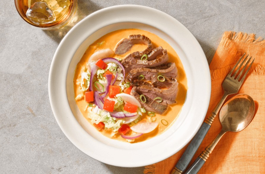 The food is a good option to the people who want to consume food that is rich in protein (37.74g/portion) yet maintain the number of calories at a manageable level of 492kcal. The amount of fats is not very high, however, it is of healthy sources such as coconut milk and sesame oil, which makes it a balanced and satisfying meal. The Tom Yum Beef Soup with Japanese Vegetables and Fragrant Herbs serves many diverse tastes, and it is also gluten-free and dairy-free, which means it can be used in a large number of different dietary requirements.