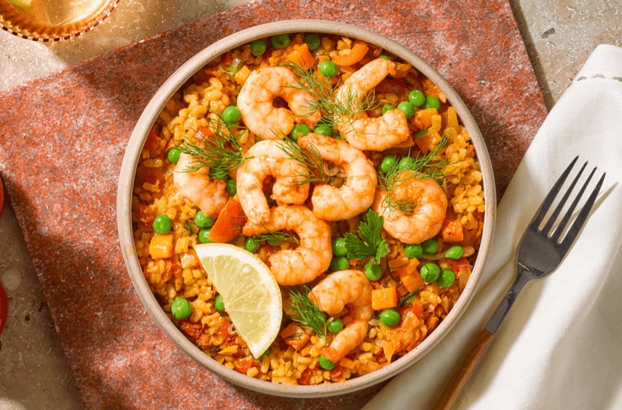 The Cajun King Prawns and Spanish-Style Rice is a fusion of the hot and spicy taste of Cajun prawns with the warm and soothing flavour of Spanish-style rice. The king prawns are marinated with a deep and aromatic Cajun seasoning, which is a perfect match with the saffron-infused bomba rice. The roasted butternut squash and peas are also added to the dish to provide colour and texture. Being a combination of wholesome foods and colourful tastes, the dish is perfect when one wants something that is satisfying and at the same time not too heavy.