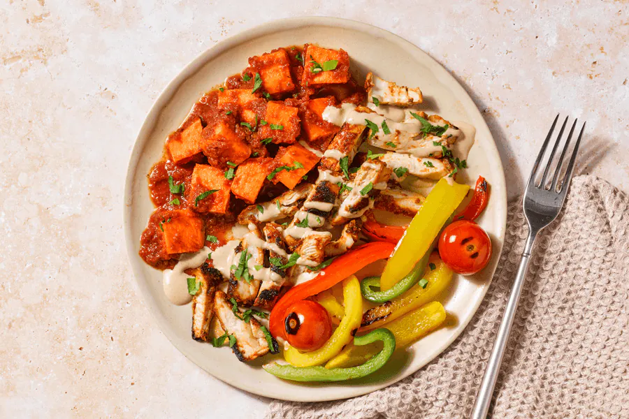 The Harissa & Tahini Chicken Thighs by Frive is a dish that should not be ignored by people who love bold and aromatic flavours. The chicken thighs are succulent and are marinated in a hot harissa and tahini mixture which makes the chicken have the ideal combination of spiciness and richness. This meal is served with a sweet potato shakshuka which makes it a warm and cozy one. Natural and nutritious ingredients will make this dish not only tasty but also healthy. The sweet potatoes is a good source of fibre and the chicken is a good source of protein hence a good meal to include in a balanced diet.