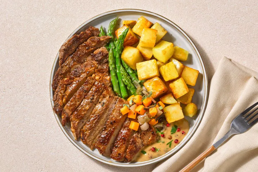 The Frive Grilled RibEye Steak is a delicacy that combines a tender ribeye steak with roasted potatoes and fresh asparagus, and it is topped with a green peppercorn sauce that is not hot. The meal is a complete balance of the rich flavours and nutrients, and the quality of the steak is high, which means that it is a good source of protein and healthy fats. Organic vegetables such as asparagus are used so that every bite is rich in vitamins and minerals that maintain general health.