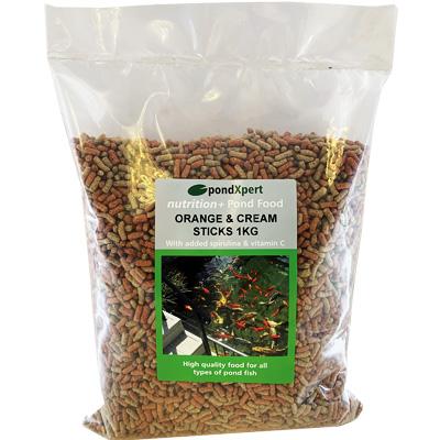 PondXpert Oranges and Cream – 4kg combines nutrition and visual appeal for pond fish. Containing cereals, vegetable protein extracts, meat and fish derivatives, minerals, yeasts, and 0.05% spirulina, these sticks provide 28% protein, 3.5% fat, and 2.5% fiber. Measuring 1.5cm x 0.4cm, they float on the surface, offering a feeding experience that stimulates natural fish behavior. Regular feeding during water temperatures above 10°C ensures optimal consumption and minimal waste removal.