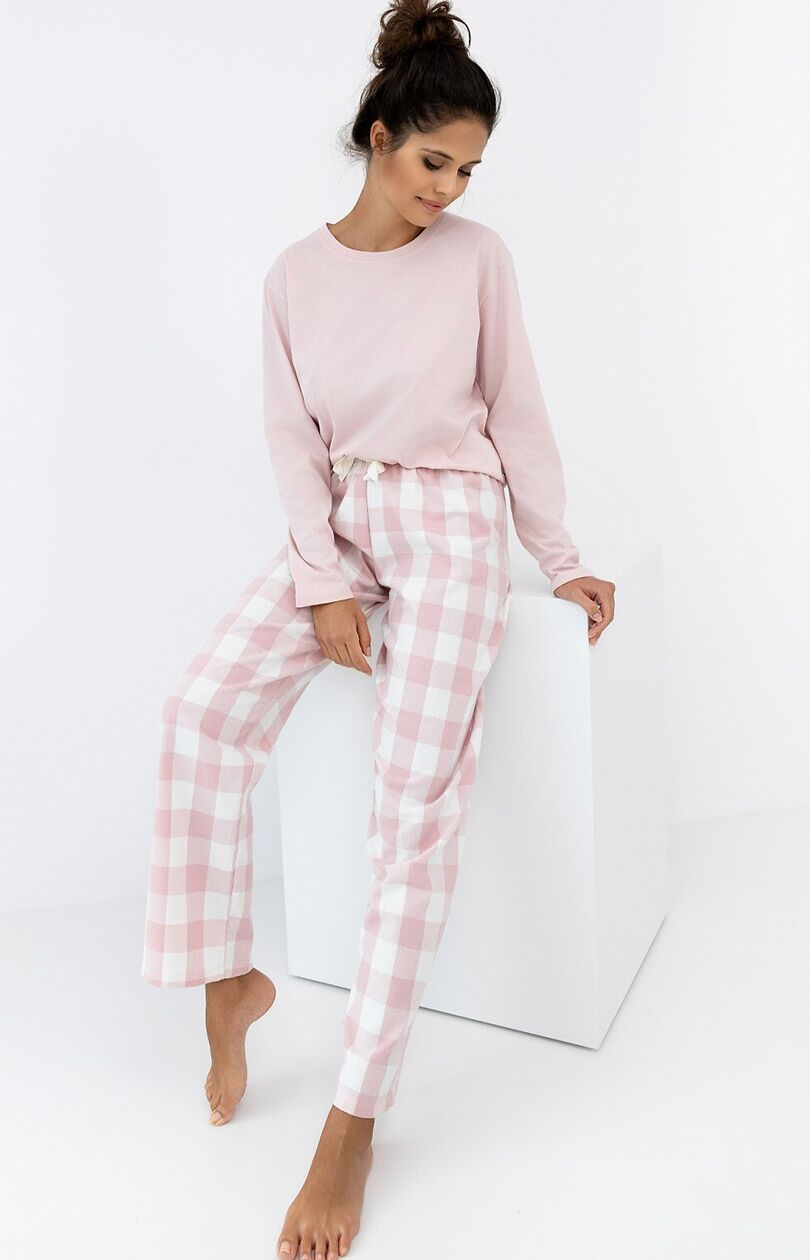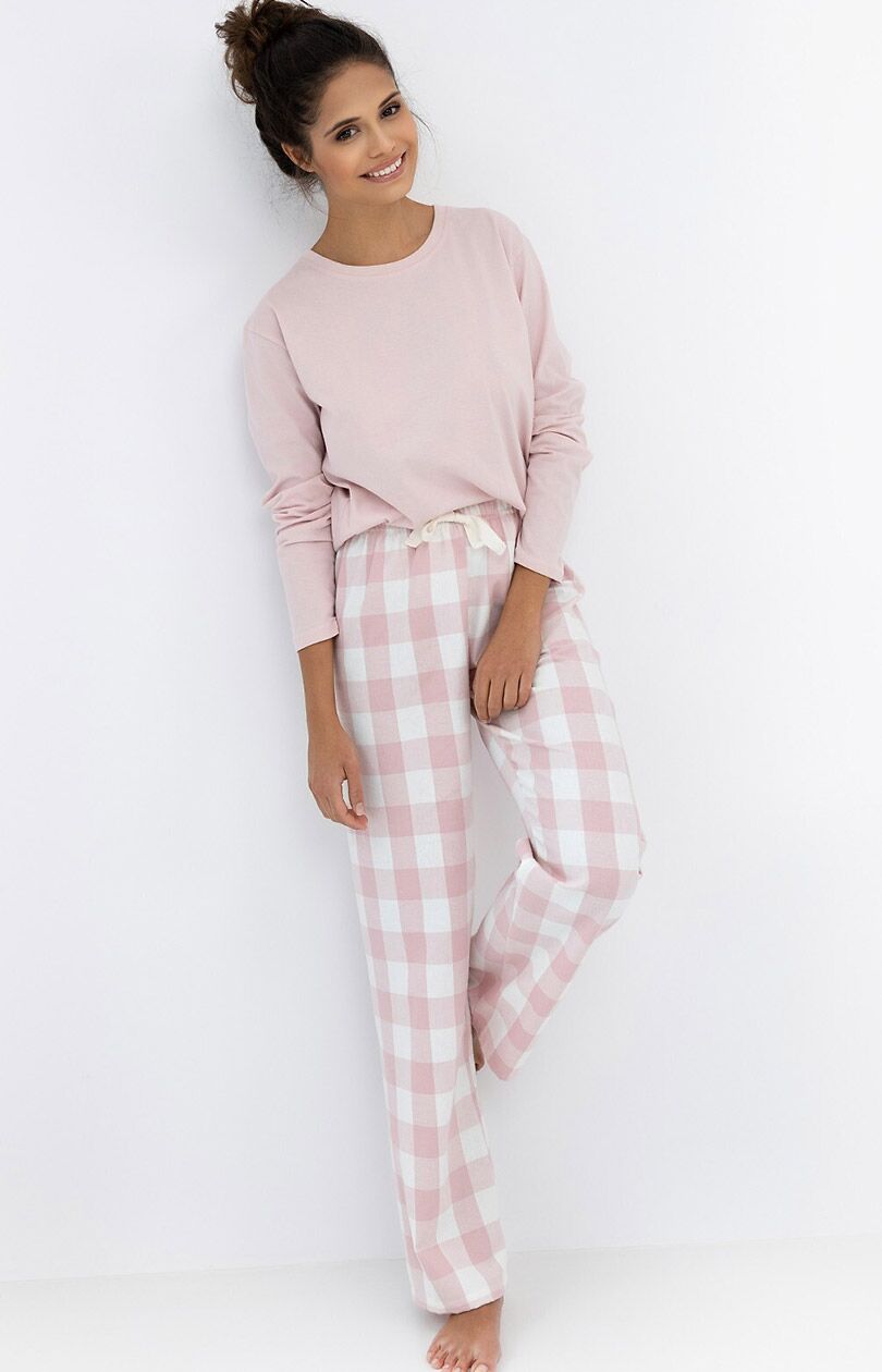 Bawełniana piżama damska Saylor  została stworzona dla miłośników klasycznych wzorów i ciepłych faktur. Bluzka wykonana jest z wysokiej jakości bawełny, ma długie rękawy i prosty, okrągły dekolt, emanując dyskretną elegancją. Flanelowe spodnie w różowo-białą kratkę zapewniają przytulne ciepło – idealne na chłodne wieczory. Ściągacz w pasie umożliwia łatwą regulację, gwarantując idealne dopasowanie do każdego typu sylwetki.