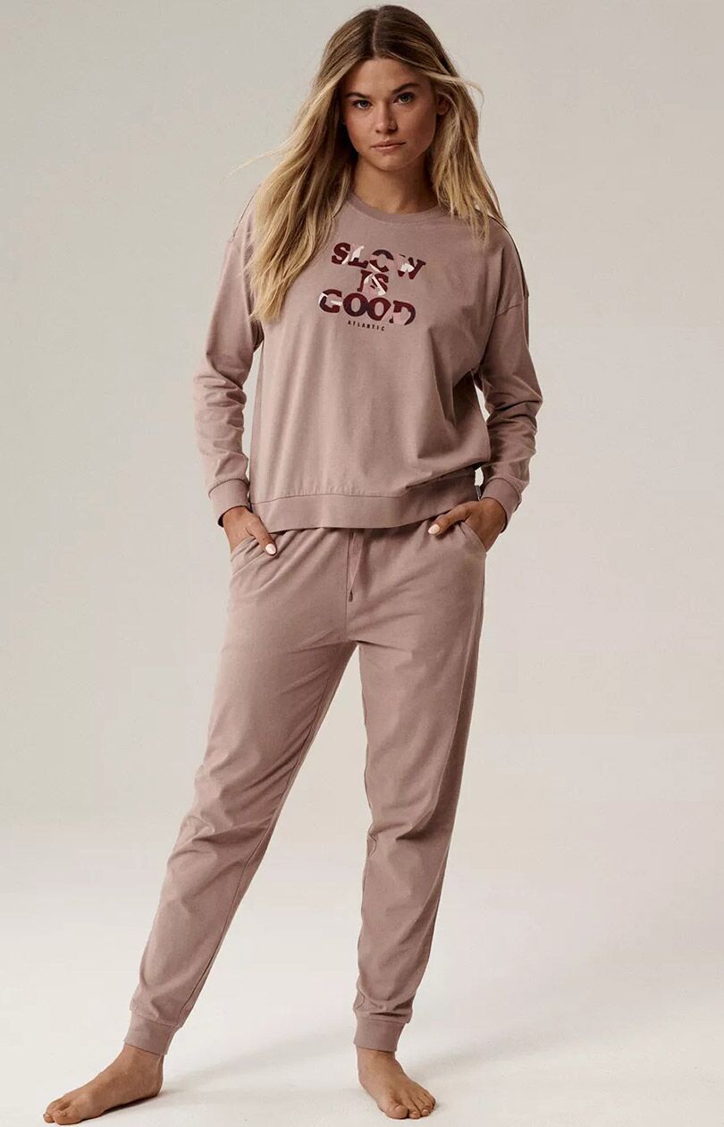 Atlantic długa bawełniana piżama damska NLP-499-BEŻOWY CIEMNY  to ucieleśnienie klasycznego komfortu otulonego nowoczesnym stylem. Zaprojektowany z myślą o maksymalnym relaksie, ten długi bawełniany komplet nocny składa się z miękkiej bluzy z okrągłym dekoltem i długimi rękawami wykończonymi mankietami dla idealnego dopasowania. Przód zdobi wyrazisty nadruk „Slow is good”, który nadaje mu nowoczesny, swobodny charakter – idealny na relaks po długim dniu. Spodnie są dopasowane dla zapewnienia wygody, z praktycznym ściągaczem w pasie i ściągaczami, które utrzymują je na miejscu. Kieszenie po obu stronach sprawiają, że komplet jest zarówno funkcjonalny, jak i stylowy, tworząc idealną równowagę między swobodą a elegancją.
